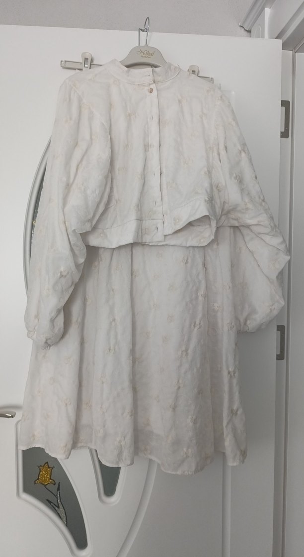 A kesim etek , balon kollu düğmeli üst, çiçek nakışlı takım, sadece bir kez giyildi