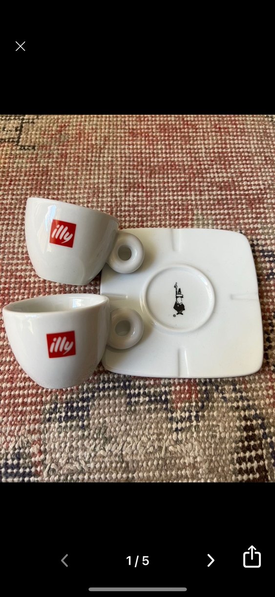 Beyaz illy espresso fincanları, 1 bialetti kare tabak da hediye . Yuvarlak kulplu ve kırmızı illy logosu bulunur. ☕
