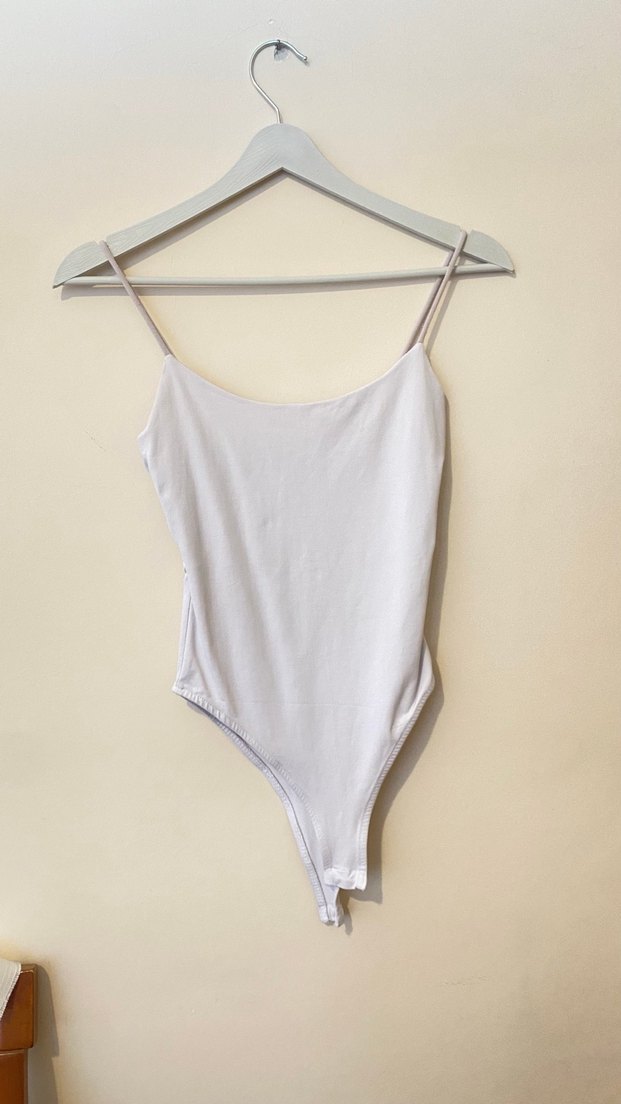 İnce askılı, beyaz renkte, düz yakalı ve vücuda oturan kesime sahip, diz boyu uzunluğunda desensiz body.