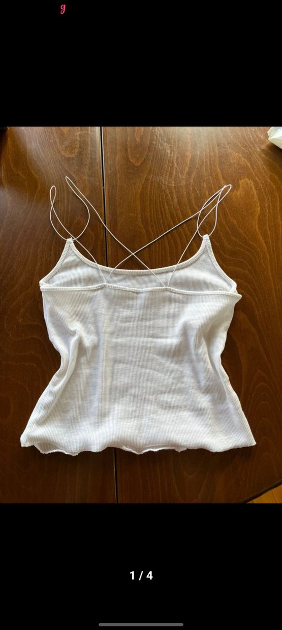 Beyaz keten kumaştan, ince askılı ve V yakalı, vücuda oturan kesime sahip kadın atlet. Minimalist ve günlük sokak stili için uygundur.