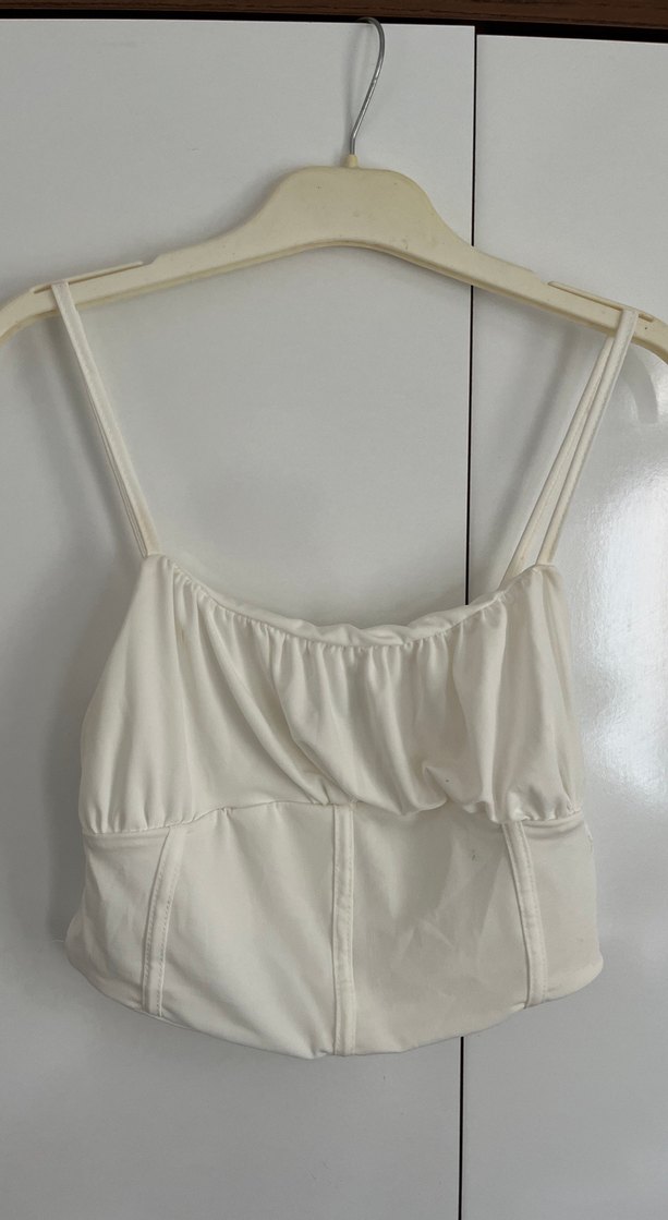 Beyaz renkli, ince askılı crop. Minimalist ve şık tasarımıyla ister gündüz ister gece kombinleriyle şık duracak bir parçadır.