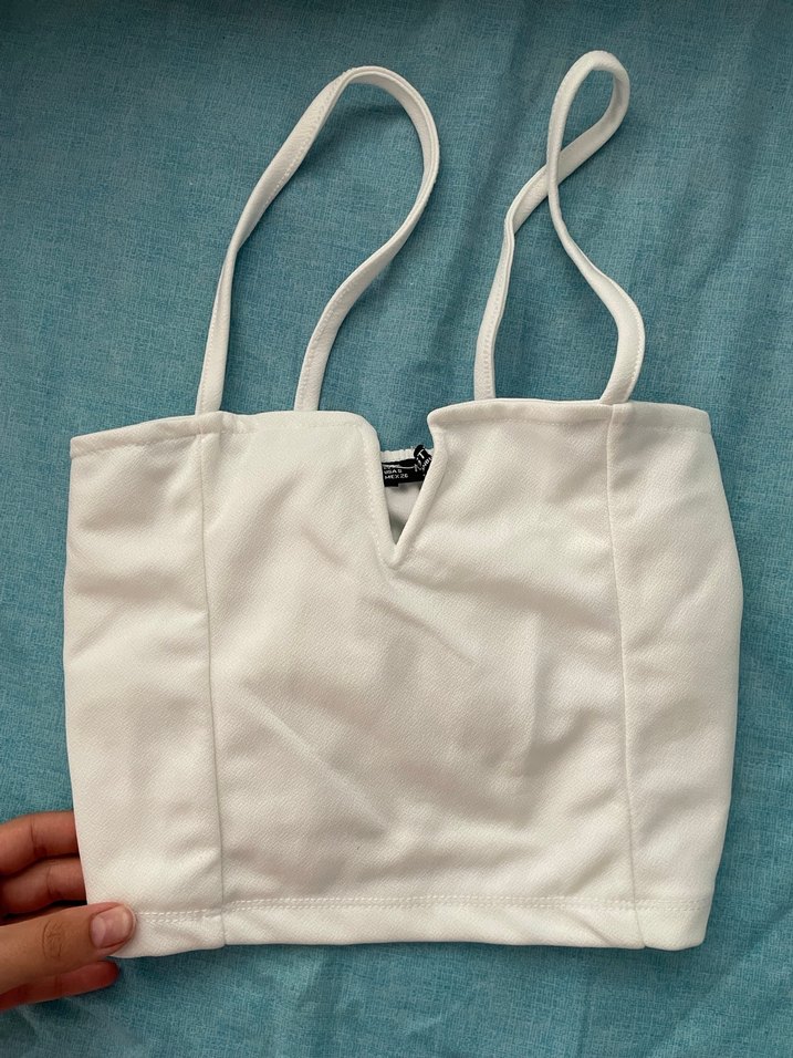 Beyaz ince askılı, hafif baskılı crop top, yumuşak kumaştan üretilmiştir. Rahat kullanım için uygundur.