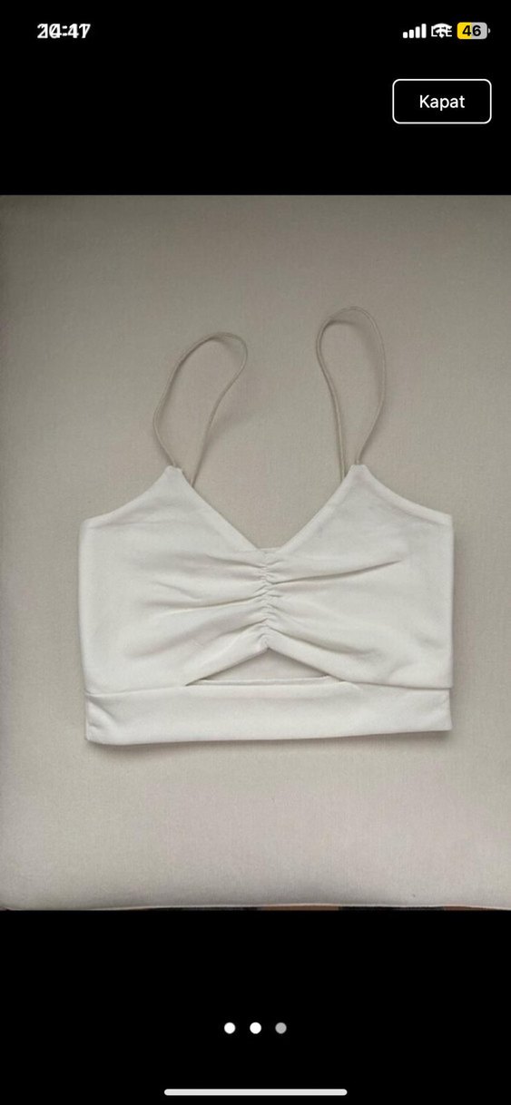 Beyaz renkli, ince askılı ve ön kısmı büzgülü crop günlük athleisure kullanıma uygun rahat bir yapıya sahiptir.
