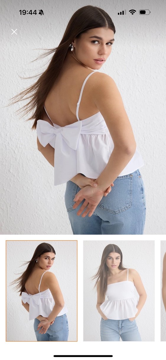 İnce askılı, arkada büyük fiyonk detaylı beyaz denim bluz, gündelik kullanıma uygun şık ve sade bir görünüm sunar. ✨