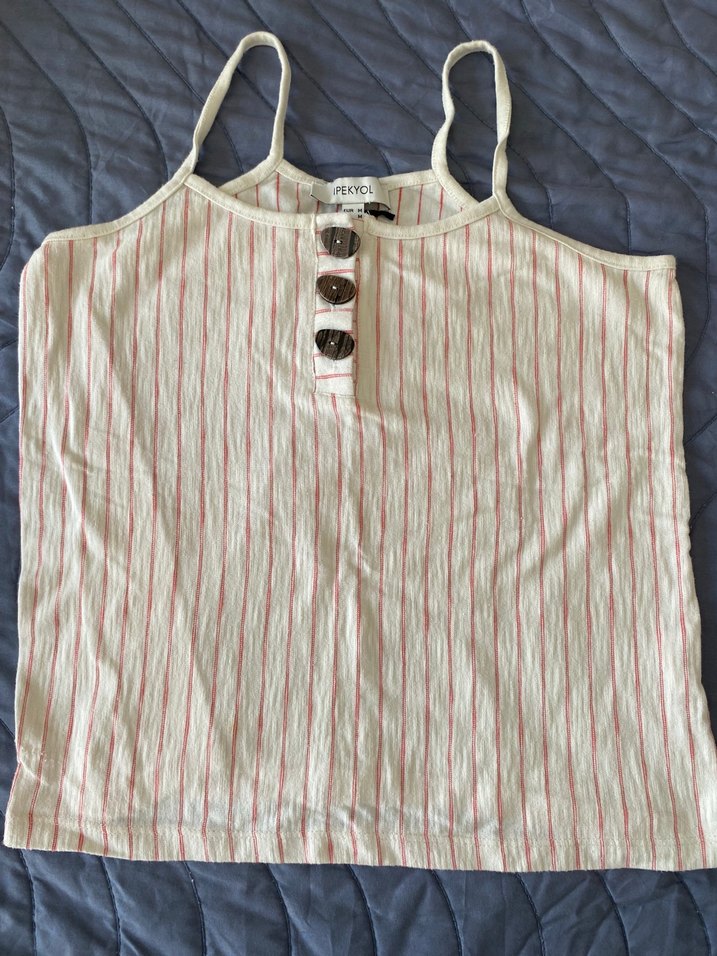 Pamuklu beyaz, ince askılı, düğmeli, bol kesim kadın atlet. Normal boyda, pastel çizgili, günlük rahat stil için uygun.  Sayılı giyildi temizdir Ürünle ilgili detaylar fotoğraflarda mevcuttur #İpekyol #ipekyolbluz #ipekyolkadın #ipekyolaskılıbluz #ipekyoltriko #askılıbluz #bluz #triko #tişört