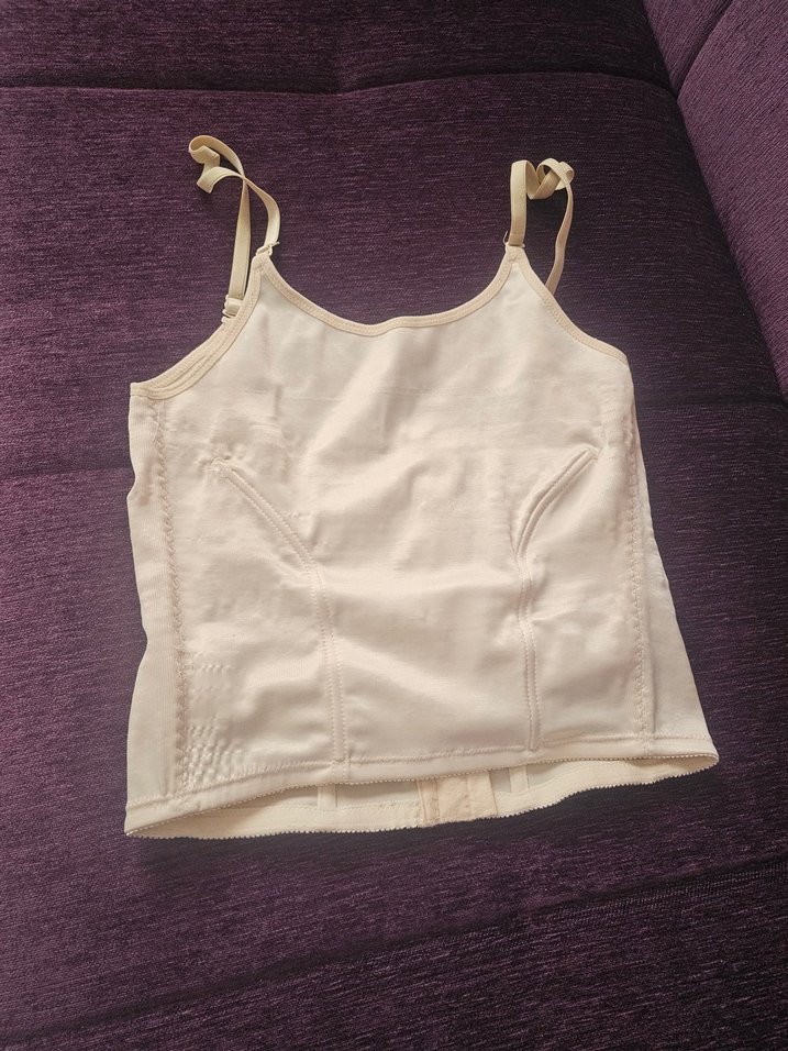 İnce ayarlanabilir askılı, beyaz renkte, düz desensiz ve midi uzunlukta, vücuda oturan hemşire korsesi. Konfor ve destek sağlar.