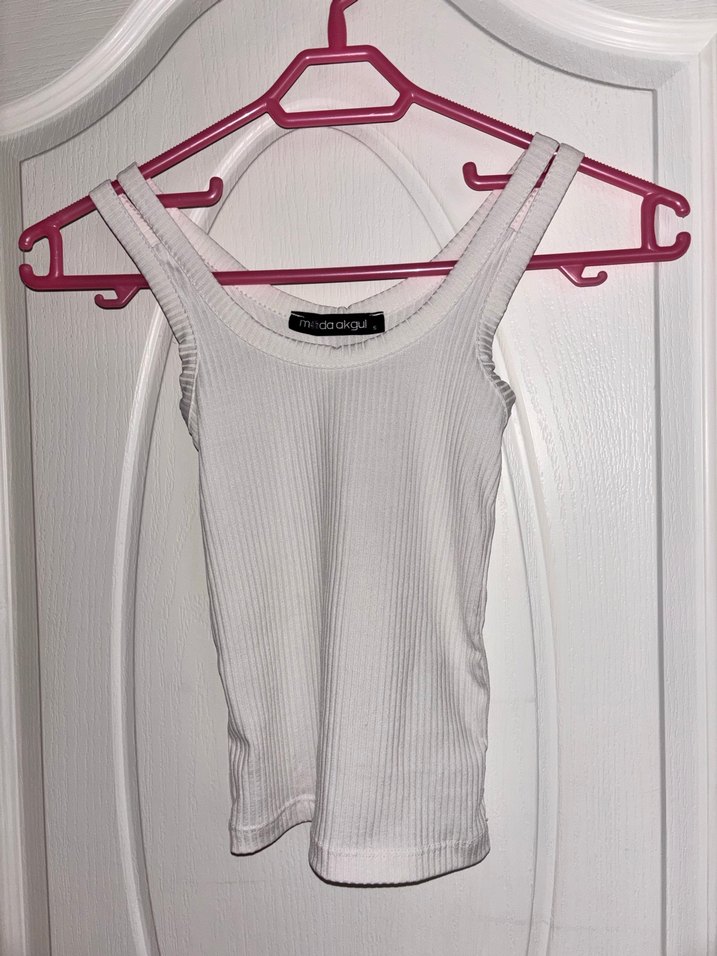 Beyaz, ince askılı ve straplez yakalı, normal midi boyda, vücuda oturan kadın atlet. Yumuşak sentetik kumaştan, sade ve desensiz tasarım, günlük rahat kullanıma uygun.