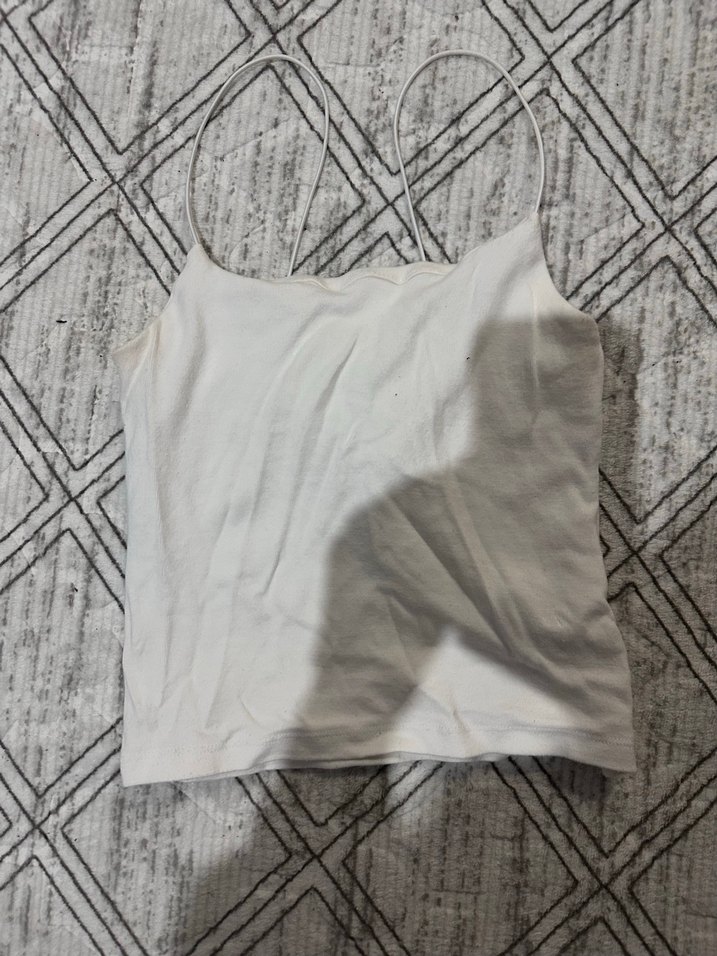 Beyaz ince askılı, tek renk ve pamuklu kumaştan yapılmış, minimal sokak stili için uygun, günlük kullanıma ideal bir kadın atlet.