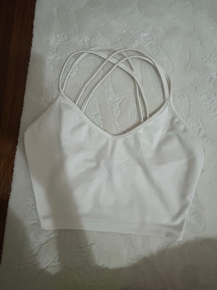 İnce çift askılı beyaz bralet, yumuşak ve pürüzsüz kumaştan. Sokak stili ve midi boyda, athleisure tarzına uygun.