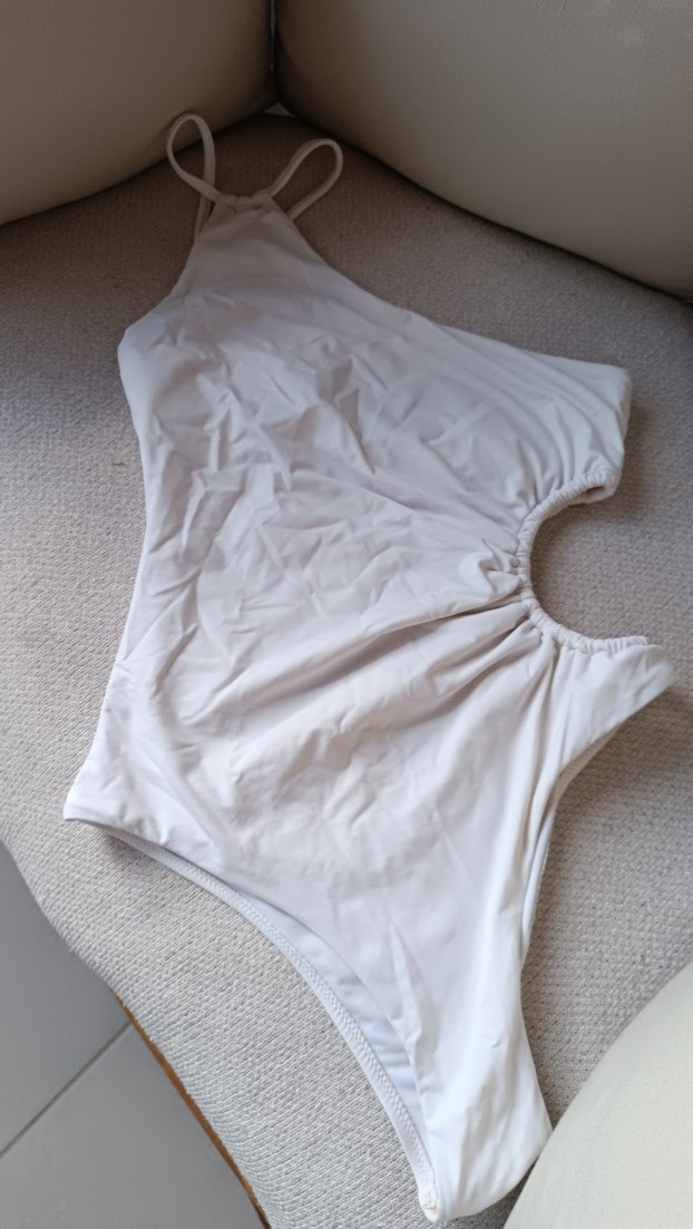 Beyaz renkli, ince askılı ve vücuda oturan kadın mayo. Minimalist ve çağdaş tarzda, plaj için uygun. ️