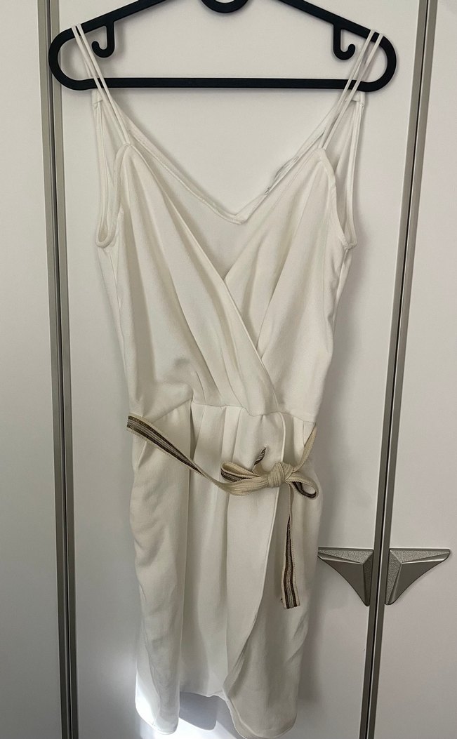İnce askılı, beli kuşaklı, bohem tarzda beyaz midi boy kadın elbise. Hafif ve sade dokusu ile şık bir görünüm sağlar.