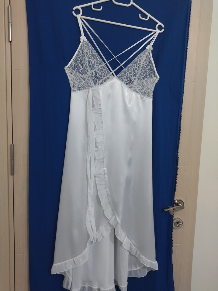Beyaz ince askılı, dantel detaylı üst kısmı ve salaş kesimi ile Paris tarzı midi gecelik. m beden gecelik