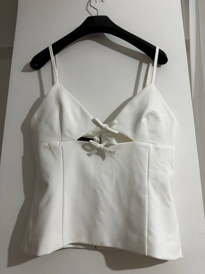 Beyaz, ince askılı ve fiyonk detaylı, sentetik kumaştan mini ve vücuda oturan büstiyer. Şık sokak stili için uygundur.