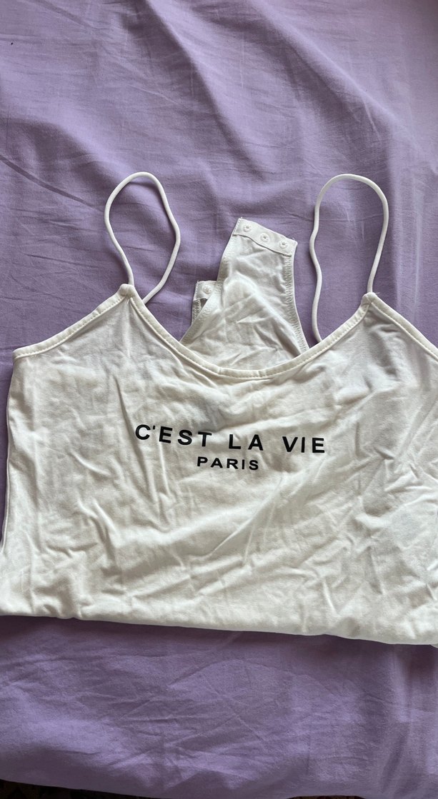 Beyaz pamuklu atlet, ince askılı, dantel detaylı ve önünde "PARIS CEST LA VIE" baskılı, günlük şık sokak stili için uygun.