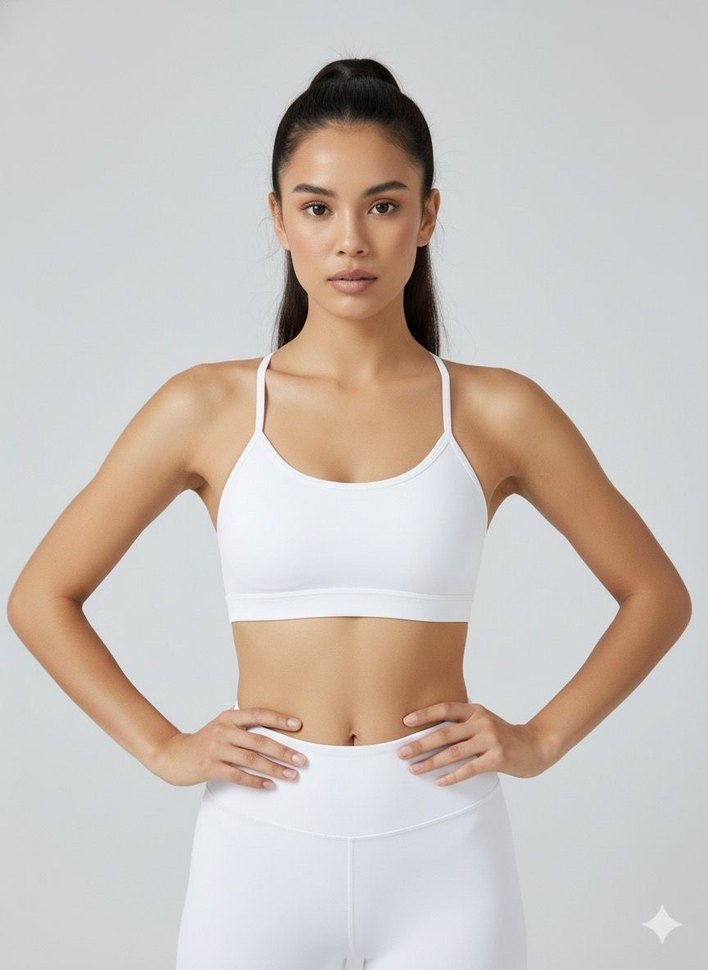Düz beyaz, ince askılı ve düz yakalı, sentetik kumaştan yapılmış, vücuda oturan spor büstiyer. Cesur athleisure ve sokak stiline uygun. ️ ♀️Standart beden