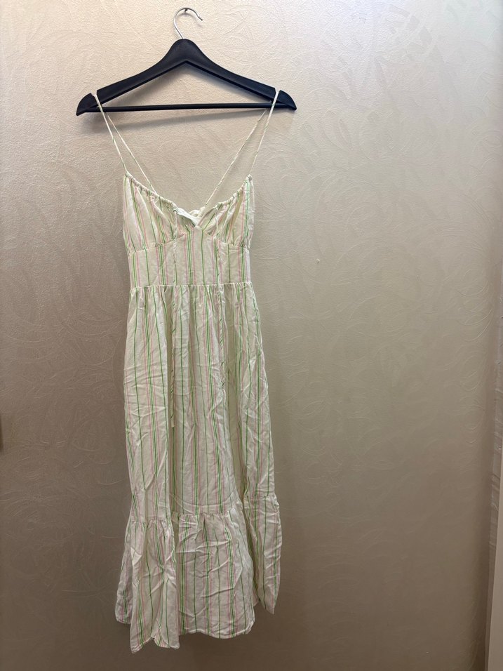 Beyaz keten kumaştan, ince askılı ve drapeli, pastel tonlarda çizgili, uzun ve vücuda oturan bohem elbise.