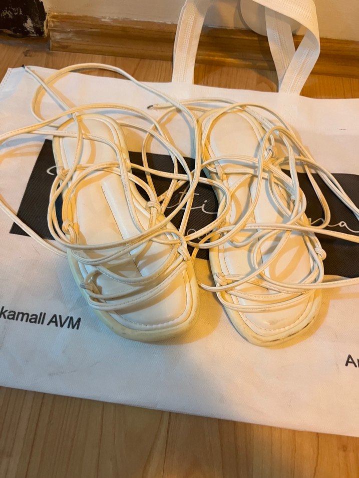 Beyaz ince elastik bantlı, kadın sandalet. Minimalist ve şık tasarım, dış mekan sokak stili için uygundur. Trendsetterlar için ideal.