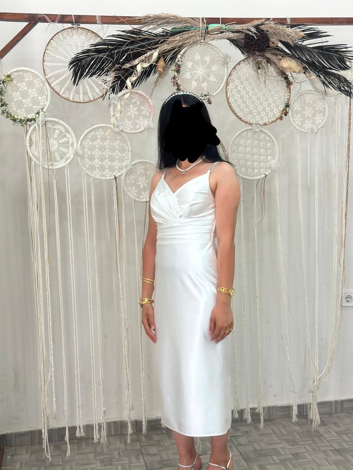 Beyaz elbise, v yakalı ve ince askılıdır. askılarında boncuk detayı vardır.Klasik şıklık ile avant-garde gotik tarzı bir arada sunar.