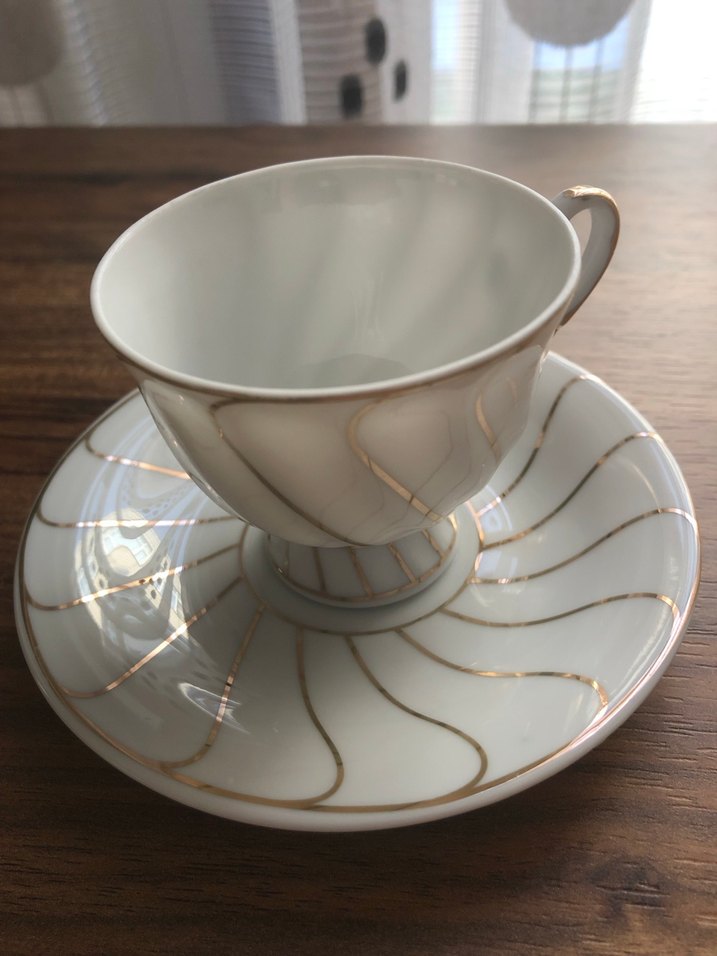 Beyaz porselen fincan ve tabağı, ince altın desenli kıvrımlarla zarif bir görünüm sunar. ☕ Bu şıklık ve sadelik asil bir kahve keyfinizin baş aktörü olmalı.