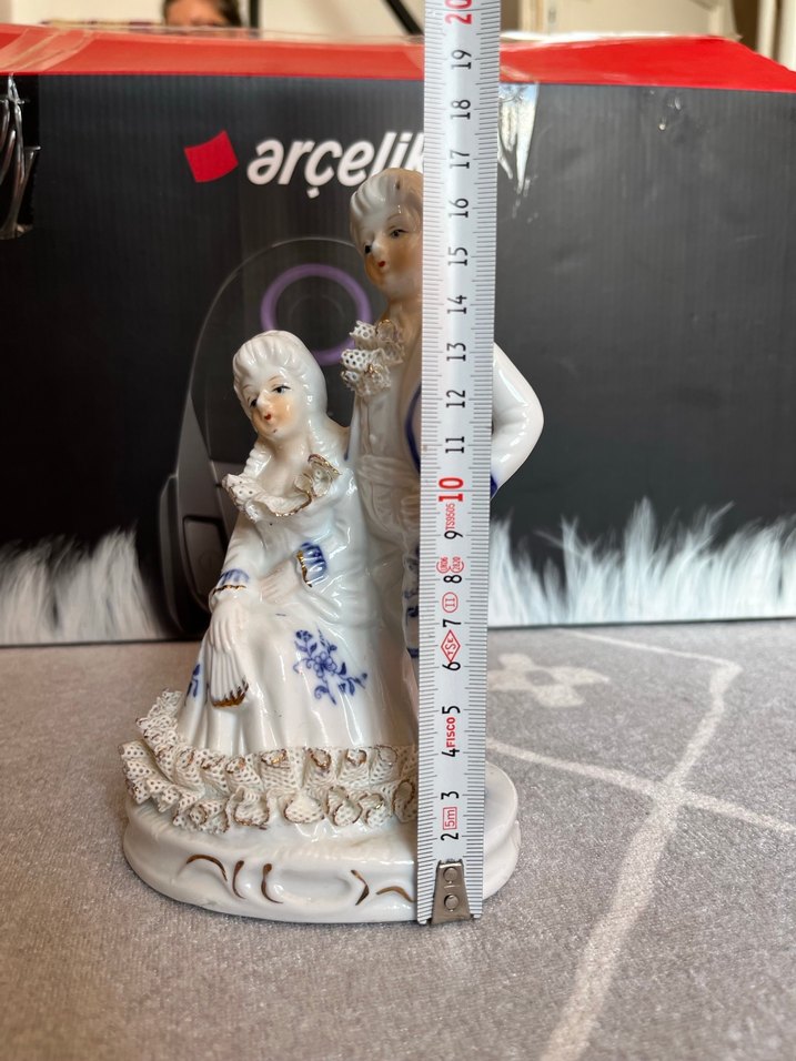 Beyaz renkte, ince dantel detaylı ve mavi çiçek desenli çift figürin. Yaklaşık 17 cm yüksekliğinde. Sayfamda 2 adet de mevcut :)