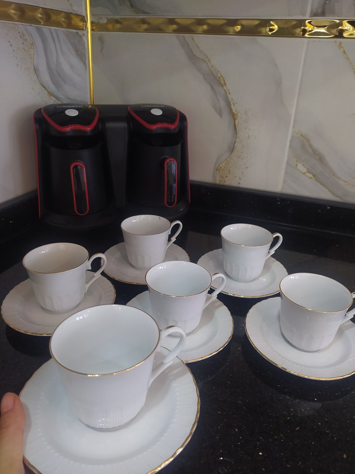 Altılı beyaz kahve fincanı takımı, ince altın kenarlara sahip. Her fincanın yanında uyumlu bir tabak bulunur. ☕