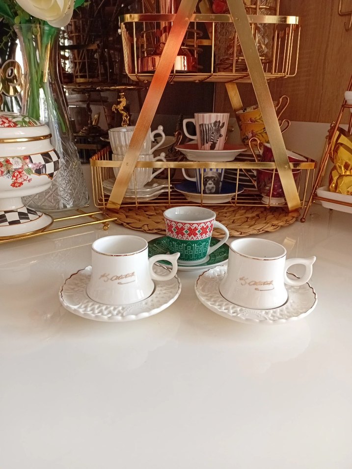 İnce altın kenarlı beyaz porselen fincan ve tabak takımı, kahve sunumu için uygundur. ☕ 3 adet fiyatıdır perotti marka