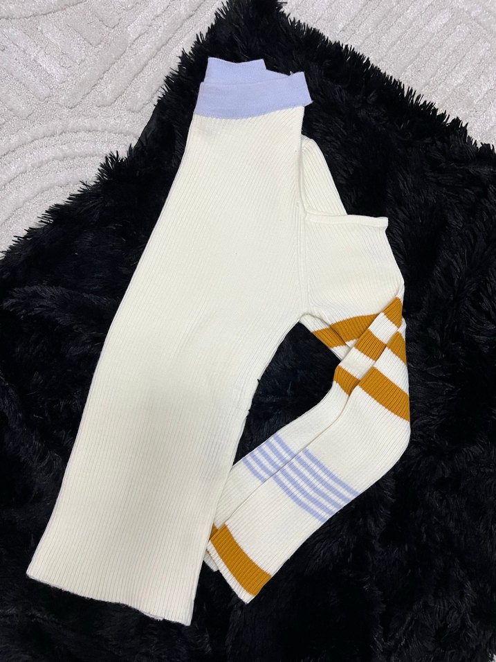 Beyaz ince örgü kumaştan yapılmış, uzun kollu, vücuda oturan kazak. Kollarında renk blokları bulunur, günlük sokak stili için uygun.