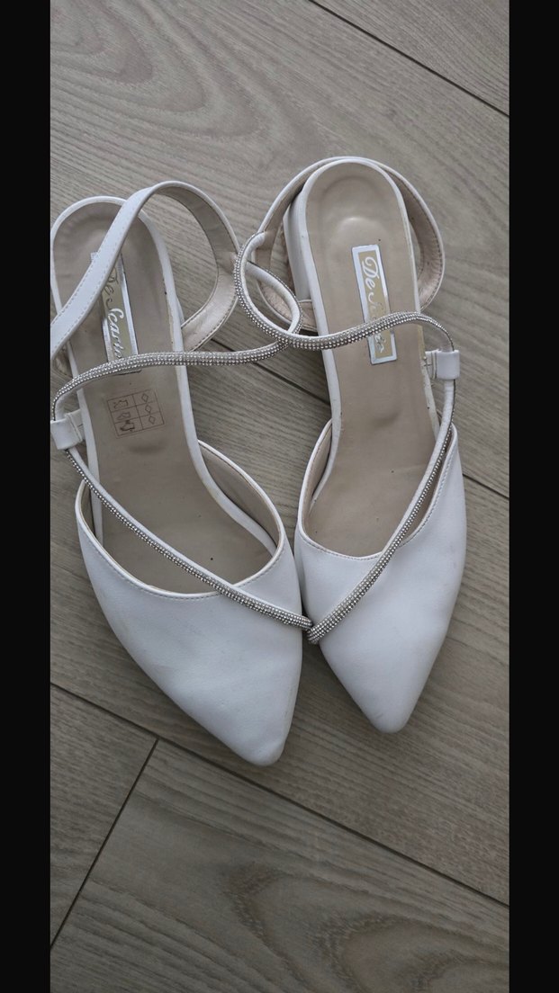 Beyaz, saten görünümlü, ince topuklu ve tokalı kadın abiye ayakkabılar, minimal ve çağdaş tasarıma sahiptir.