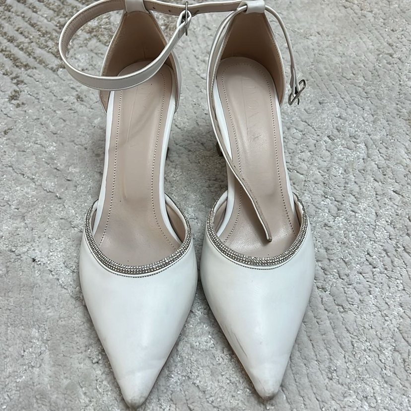 Beyaz, ince topuklu, tokalı bilek kayışlı, ipeksi dokulu kadın abiye ayakkabı. Modern klasik stil, düğünler için uygun minimal ve zarif tasarım.