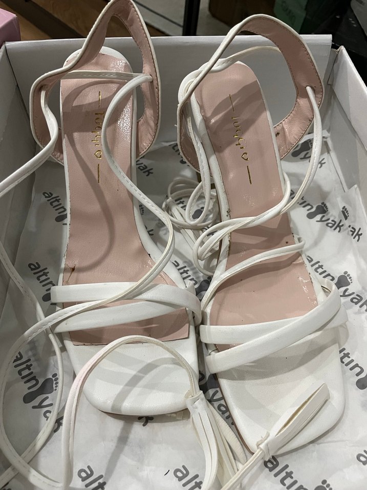 Beyaz ince topuklu kadın sandalet, ince bantlar ve bağcıklı tasarıma sahip, rahat kauçuk malzemeden üretilmiştir. İkinci görseldeki gibi leke olmuş azıcık kırmızı başka sorunu yok ürün fazlalığı