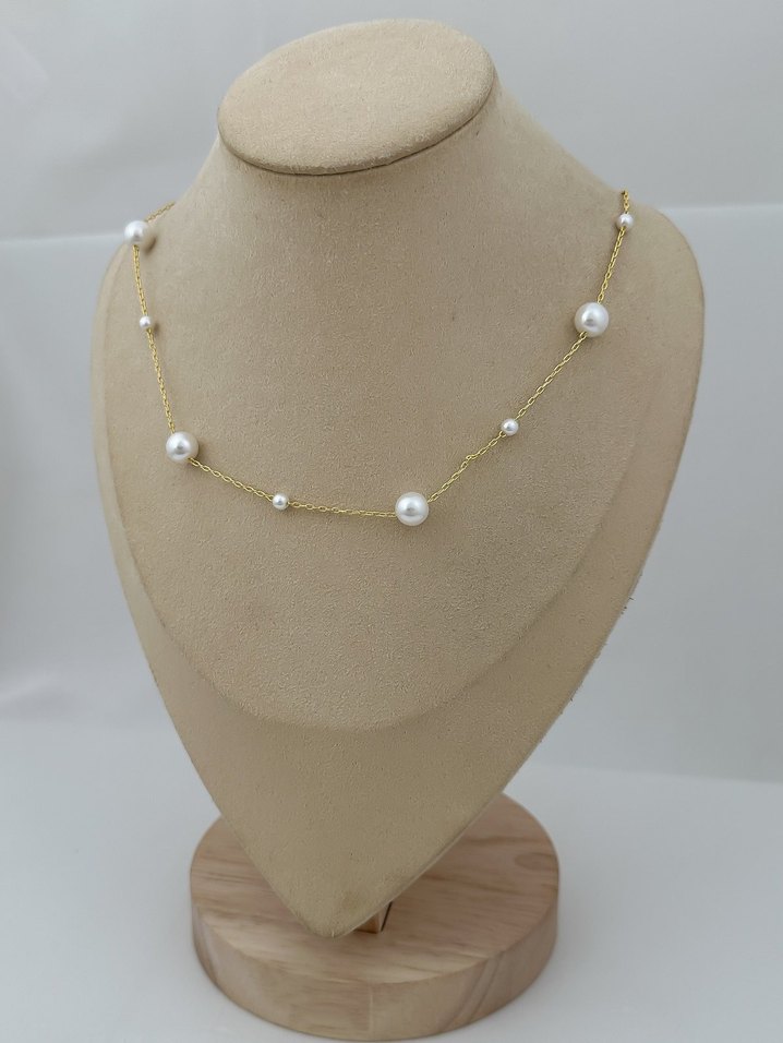 Minimalist tasarımlı, beyaz boncukların altın renk zincir üzerine serpiştirildiği midi uzunlukta sade ve günlük kullanıma uygun kolye. ✨