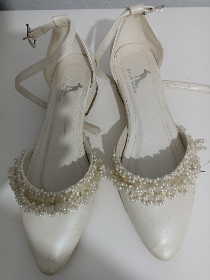 Beyaz dolgu topuklu ayakkabılar, inci detaylı burun kısmı ve bilekten bağlamalı tasarıma sahip. Düğünlere uygun klasik şıklıkta.
