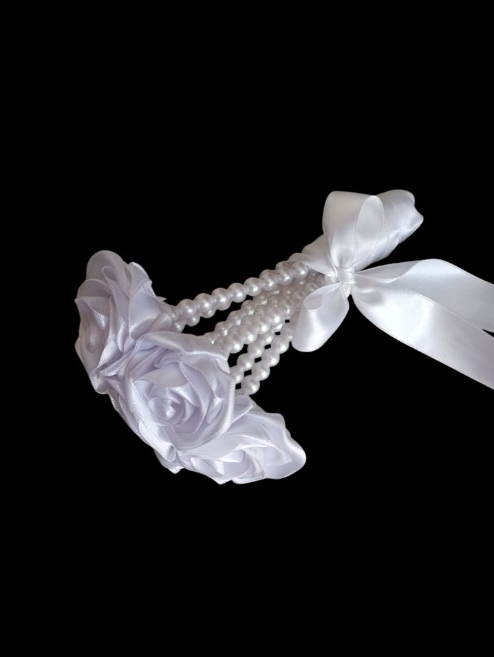 Beyaz kumaş güller ve inci taneleriyle süslenmiş, saten fiyonkla bağlanmış klasik ve avangart tarzda gelin buketi