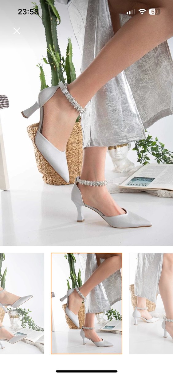 Gri renkli, ince topuklu kadın ayakkabısı. Sentetik kumaş üzerine yılan derisi desenli, inci detaylı bileklik süslemelidir. Düğün ve özel günler için uygundur.