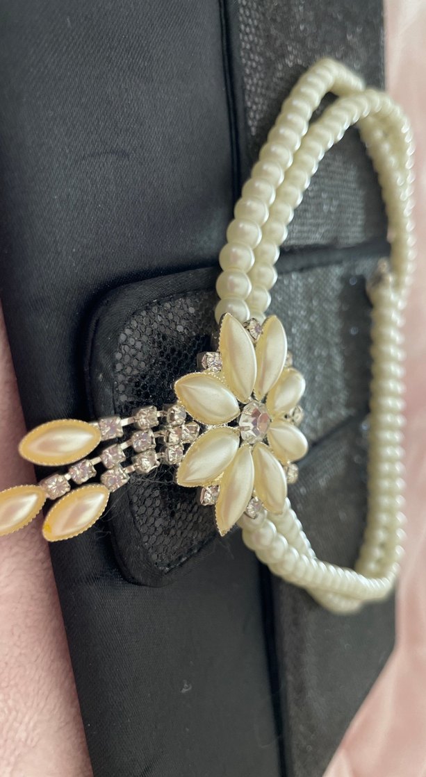 Beyaz boncuklardan oluşan, çiçek desenli ve ışıltılı taşlarla süslenmiş kadın boyun zinciri. Düğünler ve klasik zarafet için uygun.