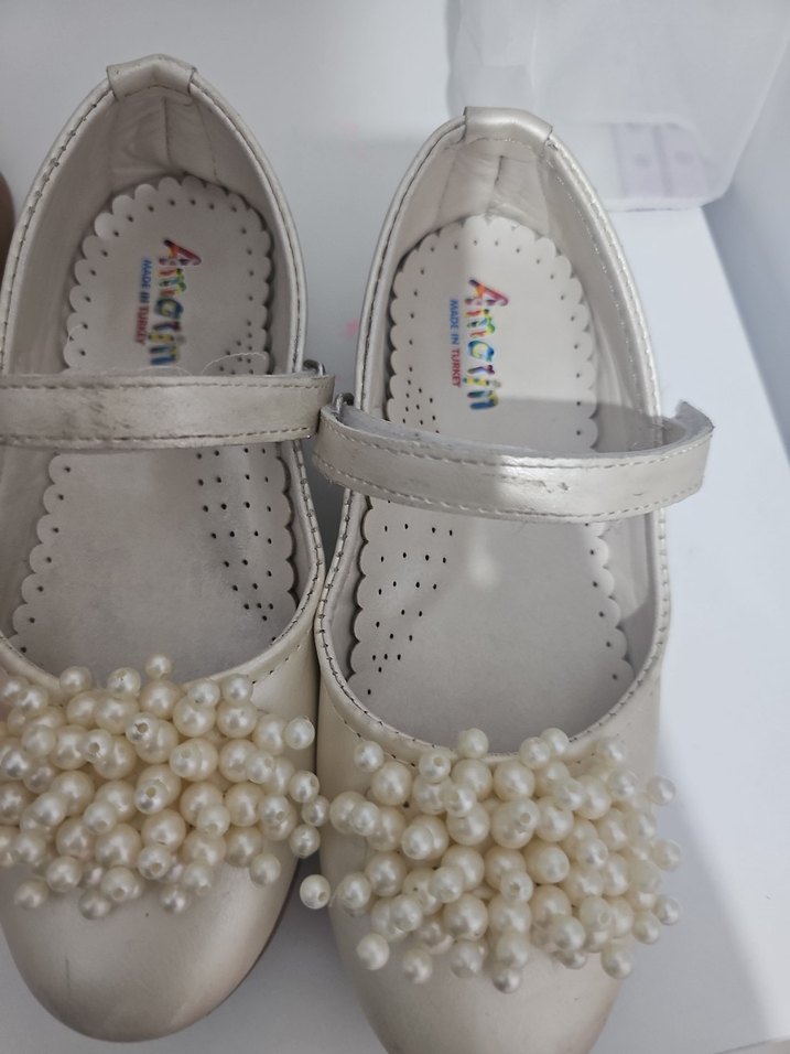 Beyaz parlak kız babetleri, işleme ve boncuk detaylı klasik tarzda. Rahatlık için kauçuk malzeme kullanılmış.