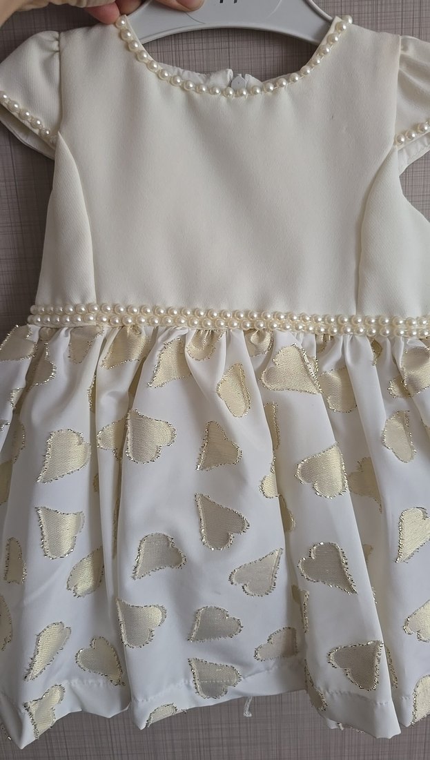 İnci detaylı, V yakalı ve askılı kız elbisesi. Nakışlı kalp desenli, parlak beyaz sentetik kumaştan, klasik ve modern şıklık sunar.