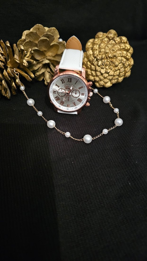 Beyaz kayışlı ve inci detaylı zincirli kadın kol saati, klasik zarafetle bohem tarzı birleştirir. Parlak yüzeyi Paris esintisi taşır. ⌚