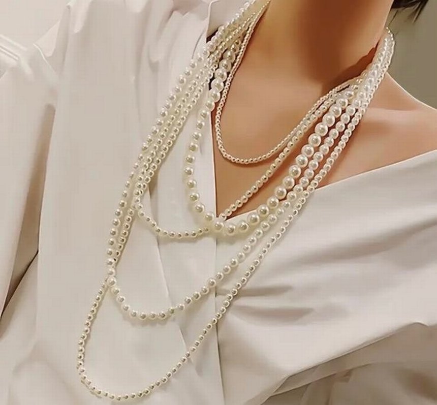Beyaz boncuklu, çoklu ipli midi uzunlukta kadın kolye. Klasik zarafet ve bohem tarzı bir arada sunar, günlük kullanım için uygundur.