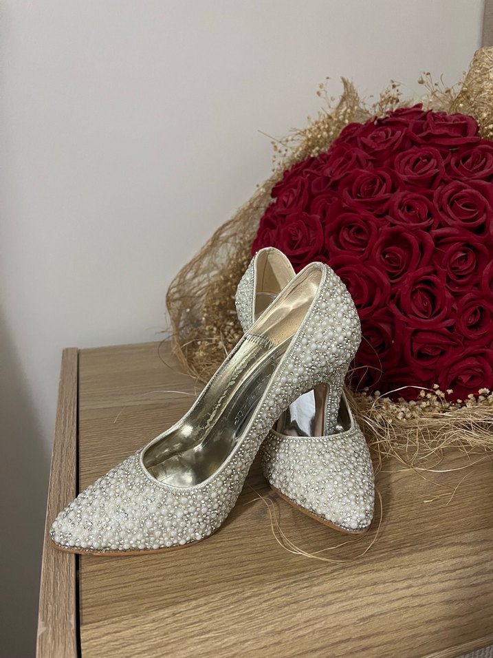 Beyaz inci detaylı ve parlak görünümlü stiletto topuklu kadın ayakkabısı, sentetik kumaştan üretilmiştir. Düğün ve şık etkinlikler için uygundur.