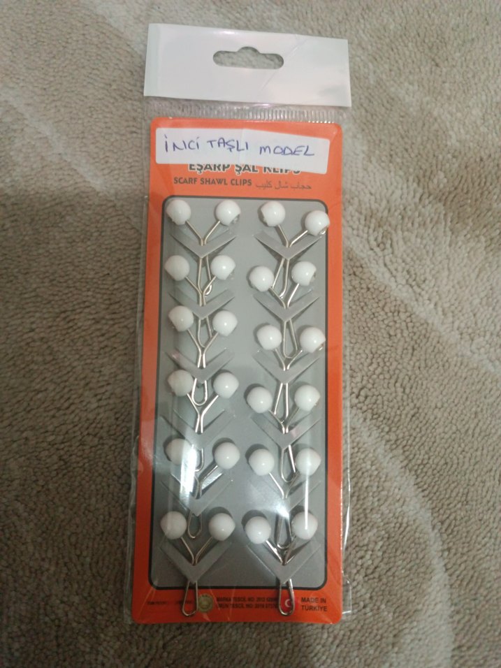 Gri metal tabanlı, beyaz inci taşlı eşarp ve şal klipsleri. 12 adet paketlidir.