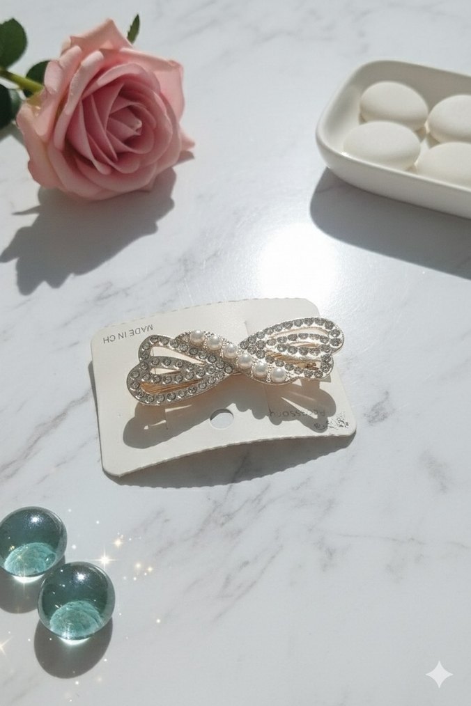 Metalden yapılmış, inci ve taşlarla süslenmiş beyaz fiyonk saç tokası, klasik zarafeti yansıtan çağdaş tasarım.