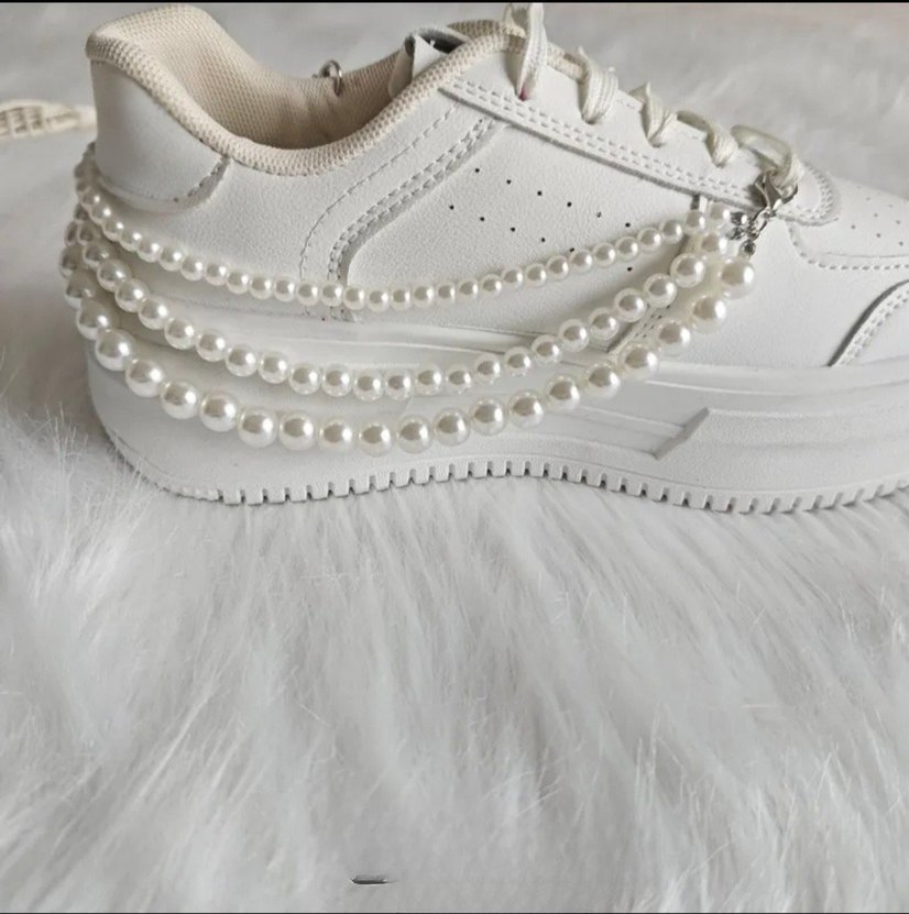 Beyaz renkli, inci zincir detaylı gelinlik aksesuarı. #Ayakkabı dahil değildir.