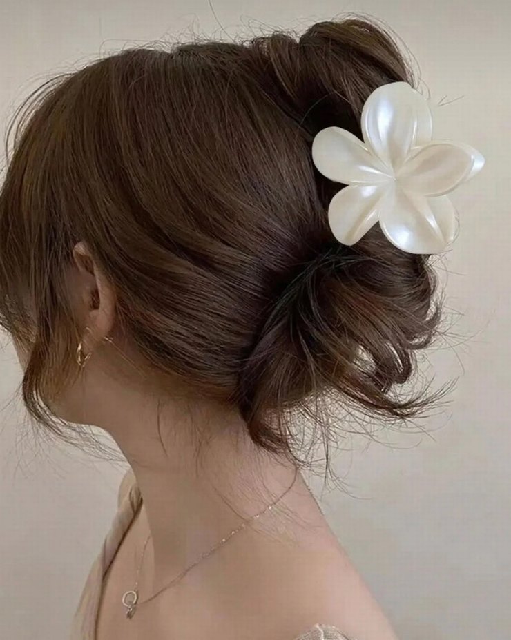 İnci detaylı, beyaz çiçek şeklinde ipeksi saç tokası. Minimalist ve bohem tarzlara uyum sağlar, saçlara yumuşak pastel dokunuş katar.
