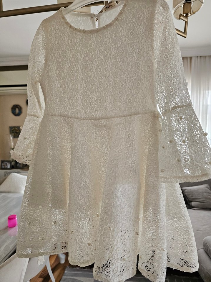 Beyaz incili Dantel Uzun Kollu Kız Elbisesi