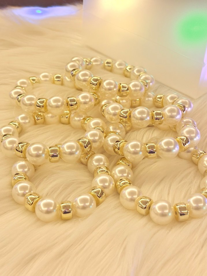 Parlak beyaz boncuklu, inci görünümlü ve altın detaylı kadın bileklik, düğün ve klasik zarafet için uygun.