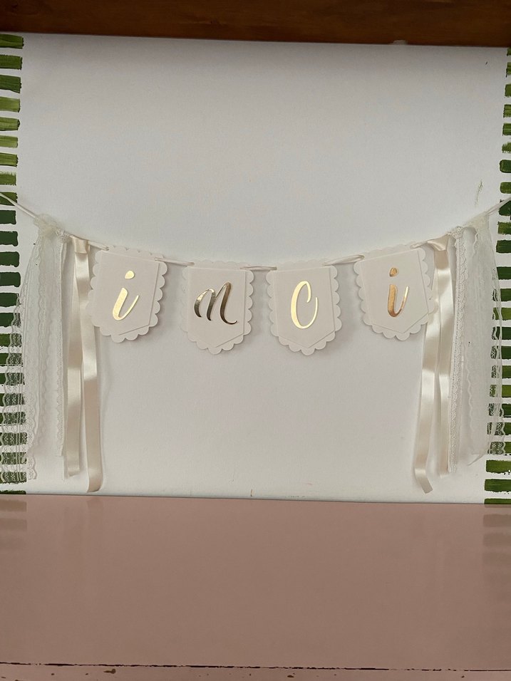 Altın harflerle süslenmiş beyaz parti süsü, asmak için ince kurdelelerle donatılmıştır.