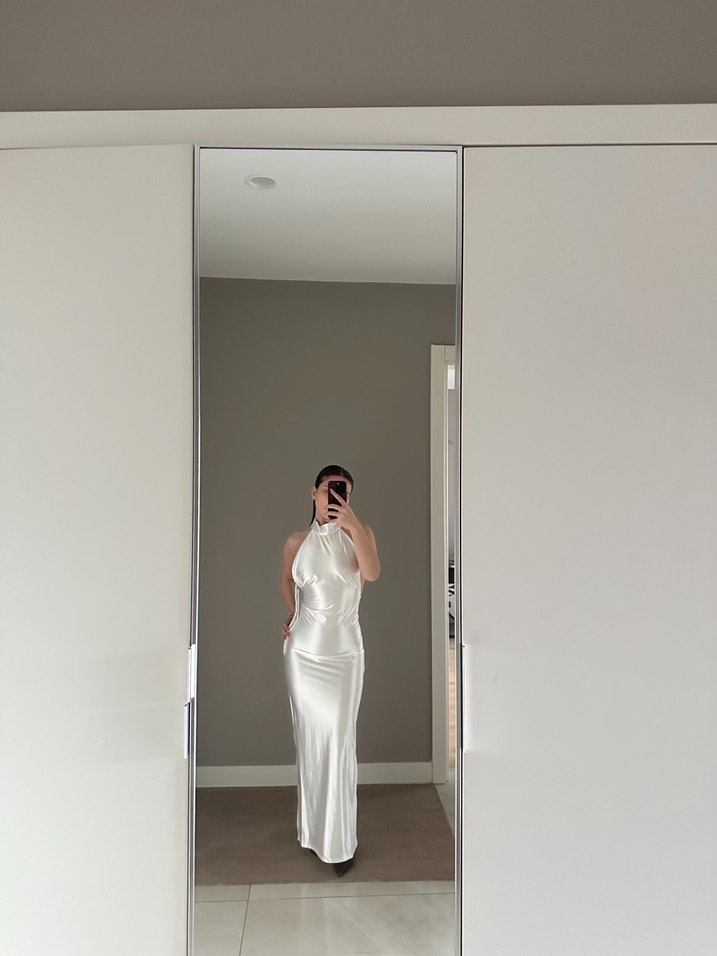 Beyaz İncili Sırt Detay Uzun Kadın Abiye Elbise