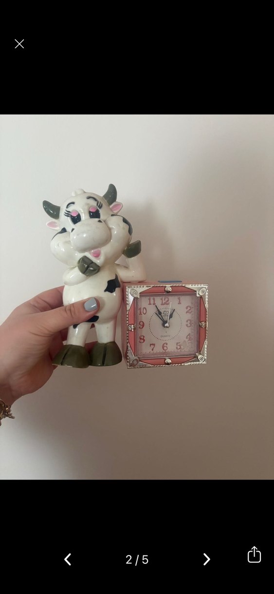 Pastel detaylı beyaz inek figürlü masa saati. Kare kadranlı, okunabilir sayılar ve dekoratif köşelere sahip.