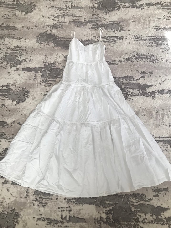 Beyaz keten kumaştan, askılı ve straplez yaka detaylı, bol kesim uzun bohem elbise. Volanlı detaylarıyla düğünler için uygun.